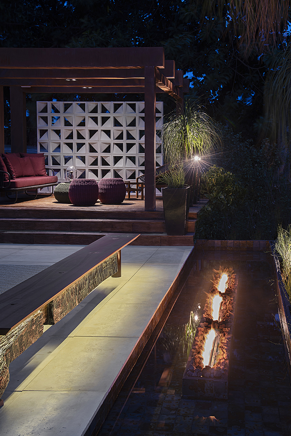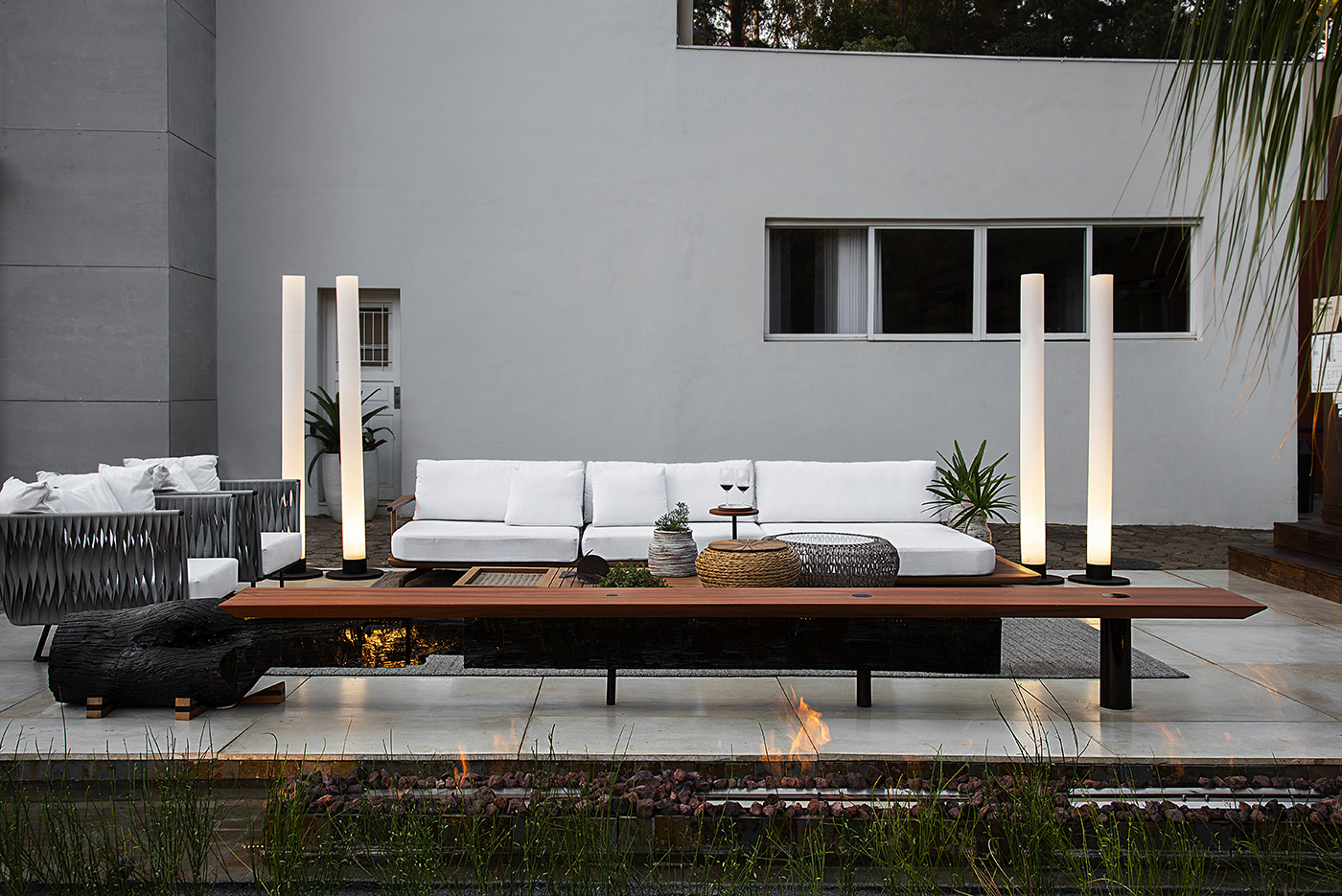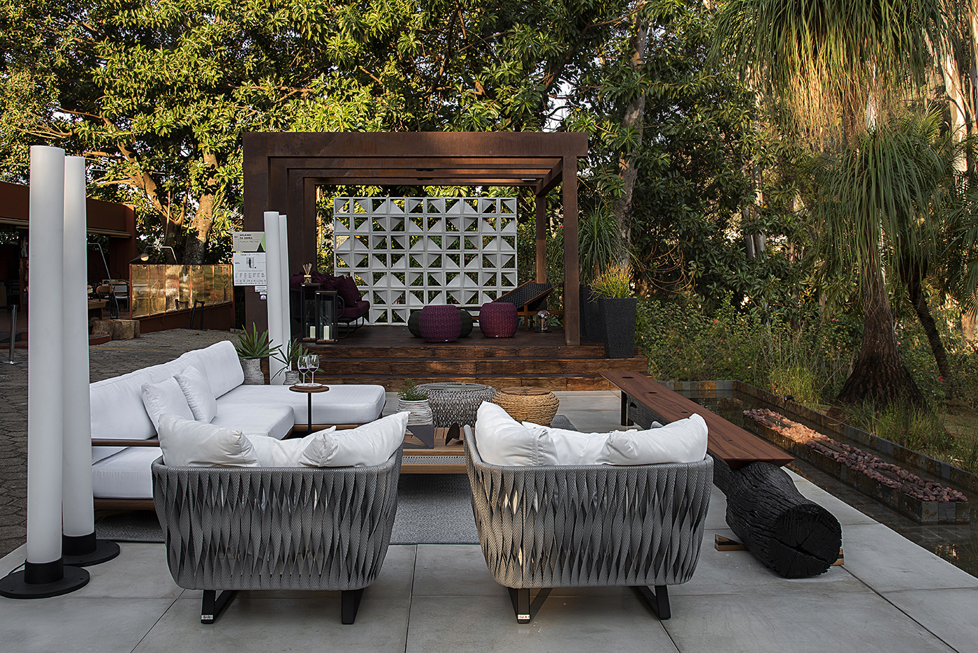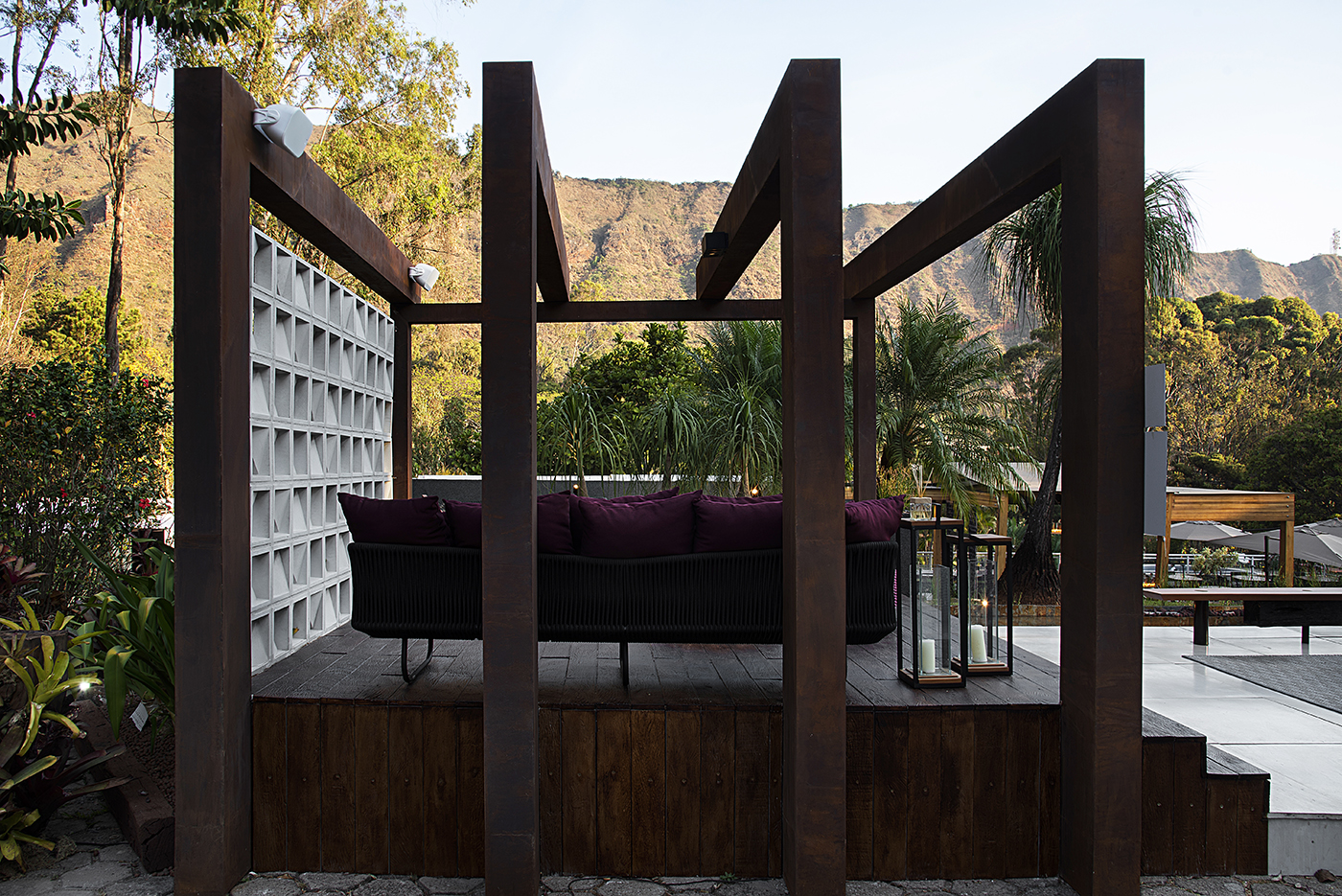 Um espaço para confraternização, contemplação e beleza. Um ambiente leve e aconchegante, onde as pessoas podem curtir com os amigos tomando um vinho e contemplando a linda Serra do Curral. O nome foi escolhido por ser um espaço aberto com muita iluminação natural, além da vista maravilhosa. Foi criado um gazebo com pórticos em aço cortém e um cobogó de placas cimentícias flutuante ao fundo. O piso do gazebo foi feito também com placas cimentícias pigmentadas na cor de madeira buscando um material resistente ao tempo, mas com um toque confortável, quente e sustentável. As cores e acabamentos escolhidos para o mobiliário foram pensados para dar um toque de personalidade e fazer uma a integração perfeita com a natureza. A iluminação em colunas ressalta os detalhes do ambiente, oferecendo um local agradável de permanência também quando o sol se põe. Destaque para o banco Esteio que oferece um espaço onde os convidados podem se aquecer perto das lareiras do espelho d´água. Este resultado surpreendente é fruto de muito trabalho, dedicação e esforço.